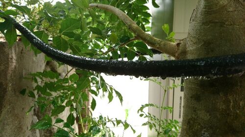 植木の水やりを楽にするため、灌水ホース(水がにじみ出てくる)をはわせました。蛇口捻って、10分から15分放置するだけなので、だいぶ時間も手間も省けます。汗もかかないし、蚊にも食われないし、オススメです。 ただ圧は30mまでしかいけません。 蛇口も二股…